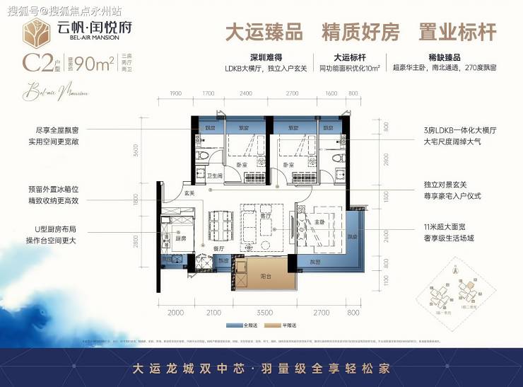 设计特点:横厅格局,客餐厅与阳台一体化,开间达 3.5 米,主卧带 270° 飘窗及独立卫浴,次卧可改造成多功能房。