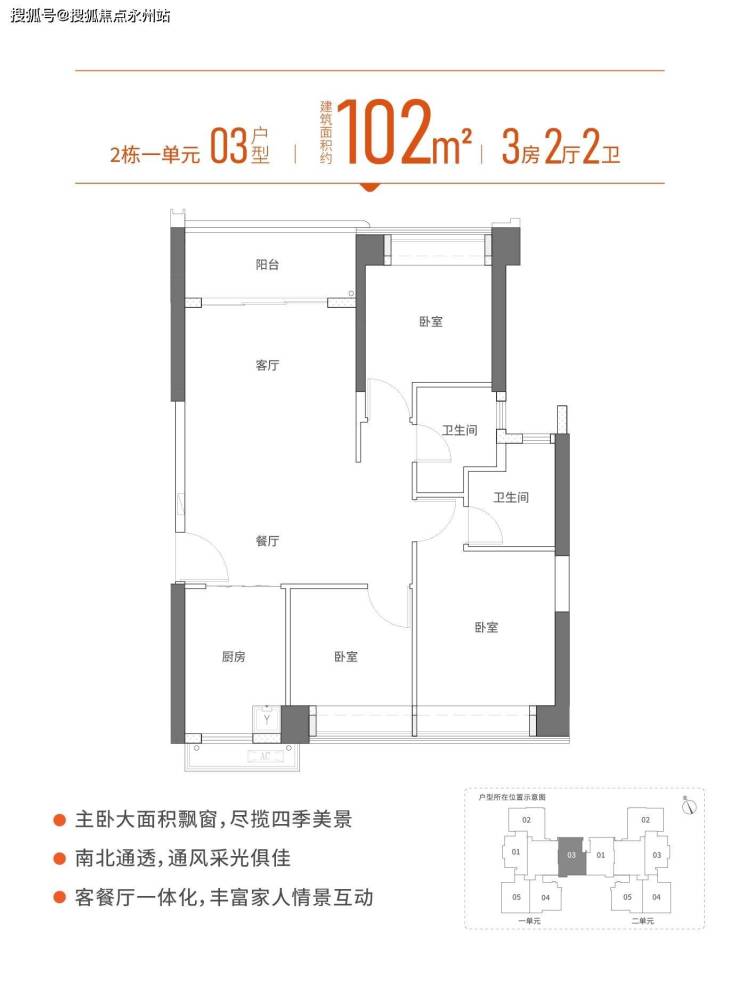 102㎡的3房2厅2卫,02户型,设计的是竖厅南北通透格局,客厅3.5米开间,LDKB一体化设计,动静分区,三开间朝南,U型厨房,卫生间干湿分离,得房率:72.3%(不含赠送),西北或东南朝向。