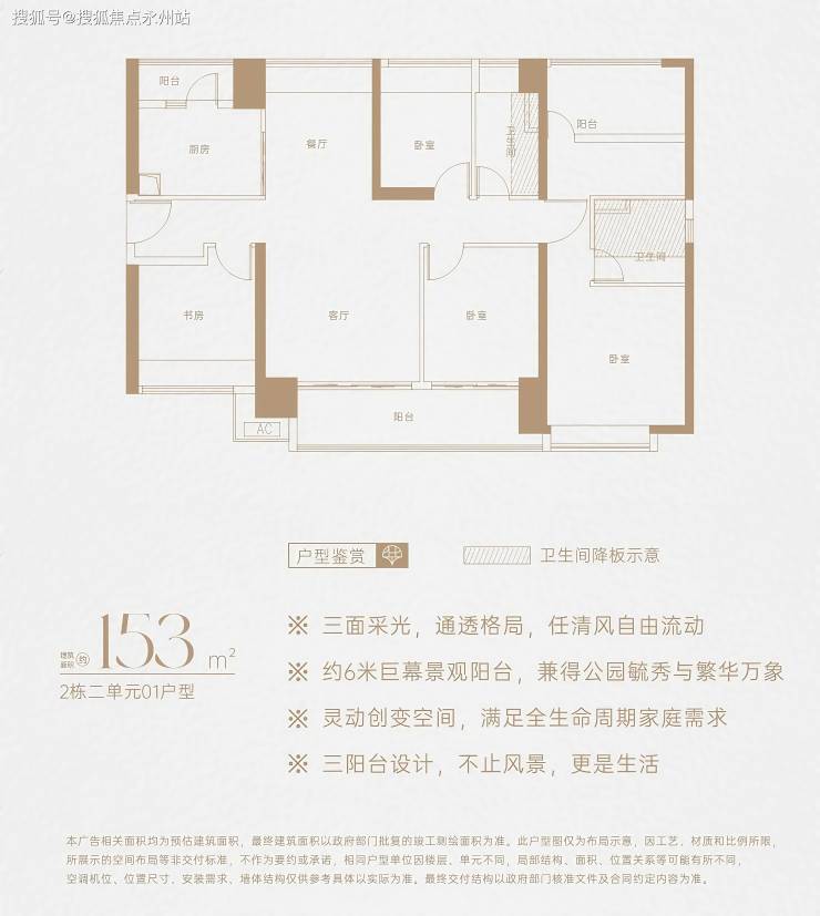 153㎡ 5房2厅2卫:竖厅南北通透,三面采光,6米景观阳台(连接客厅与次卧),U型厨房+生活阳台,得房率约73%(不含赠送)