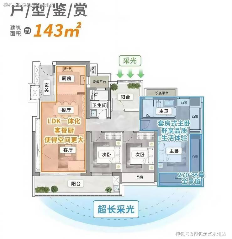 核心布局:LDKB 一体化设计,四开间朝南,客厅连接次卧出巨幕阳台(约 7.6 米),双主卧套房设计(含独立卫浴和衣帽间),U 型厨房带家政阳台。