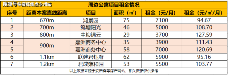 目前距离本项目约700m的45㎡产品的月租金可达5000元,同时周边73㎡产品的月租金可达7000元