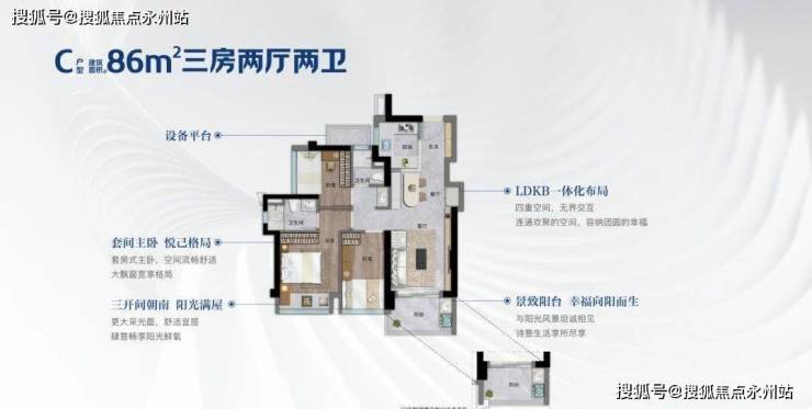 86㎡3房2厅2卫:也是竖厅设计, 进门入户玄关,S墙设计预留冰箱位,U型厨房,餐客厅一体连接阳台,公卫三段式分离,不同的是,三开间朝南,阳台是东南或西南朝向。