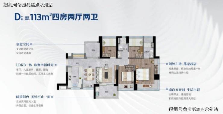 113㎡4+1房2厅2卫:横厅南北通透设计,餐客厅一体化,U型厨房,五开间朝南,公卫三段式分离,阳台主朝东南或西南向,可以改5房。