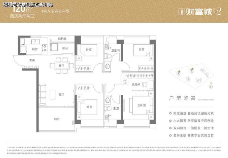 120㎡的4房2厅2卫:设计的是竖厅南北通透格局,双阳台设计,客厅3.6米开间,4个卧室分别是3.2/3.2/2.75/2.75米的宽度,U型厨房,阳台主朝东南、西北、东北向。