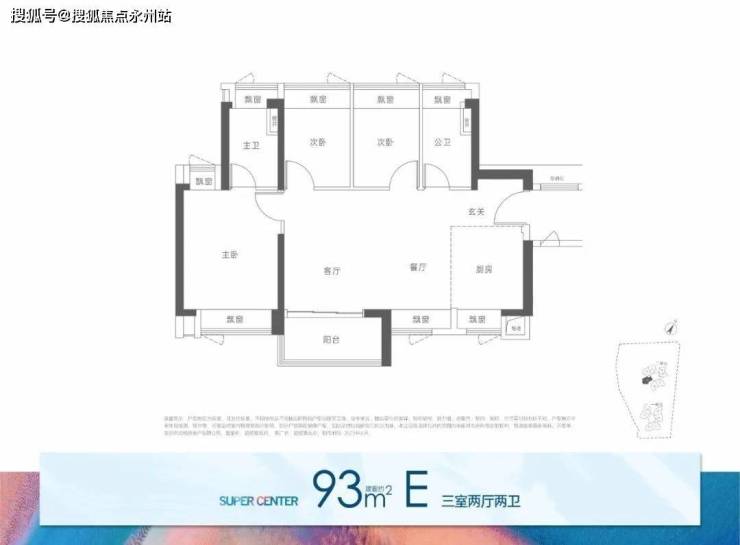 93㎡的3房2厅2卫:设计的是竖厅格局,进门入户玄关,客厅3.4米开间,LDKB一体化,S墙设计预留冰箱卡槽位,次卧双飘窗,U型厨房,公卫三段式分离,得房率:74.53%(不含赠送),阳台有西向、东北向、东南向。