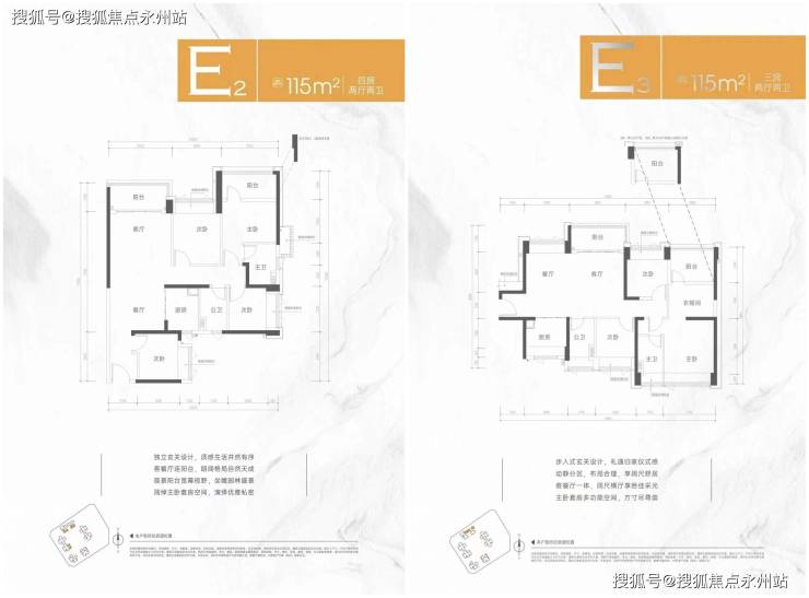 115㎡四房两厅两卫E2:户型东南和东北朝向,竖厅设计。不用改造,标准双阳台四房设计。和横厅115平相比,少一个面宽,赠送面积少了一个厨房飘窗和两个卫生间飘窗,套内实际使用面积估计会小一点。过道面积明显比横厅115的要大,空间利用效率会低一些。