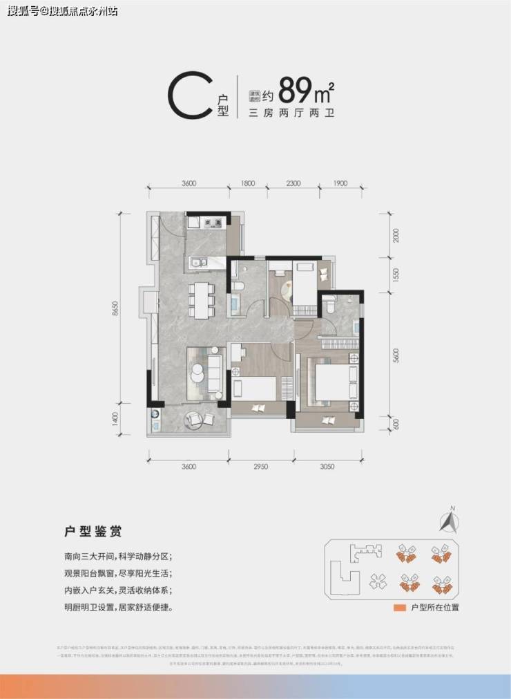 89㎡ 3房2厅2卫:三开间朝南,奢阔主卧套房
