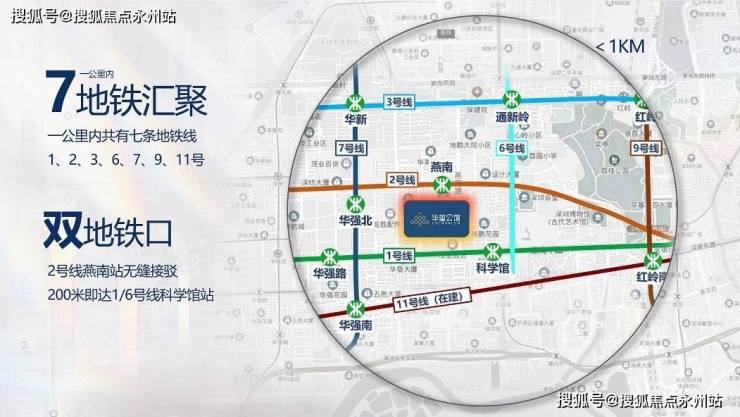 轨道交通:项目为三地铁交汇物业,距离2号线燕南站仅50米,步行300米可达1号线/6号线科学馆站,800米范围内覆盖1、2、3、6、7、9、11号七条地铁线,50余个地铁站口密集分布,30分钟内可直达宝安机场、香港西九龙等重要枢纽。2025 年新增的地铁11号线二期(华强南站)和穗莞深城际前皇段(皇岗口岸站)将进一步强化区域交通能级,实现大湾区“半小时通勤圈”