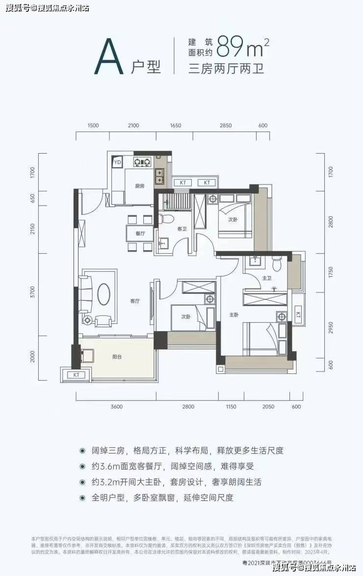 89㎡的3房2厅2卫:折后总价约190万/套起,折后单价约2.15万/㎡。