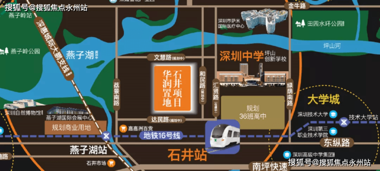 项目距离16号地铁石井站约300米,深圳中学坪山创新学校约400米