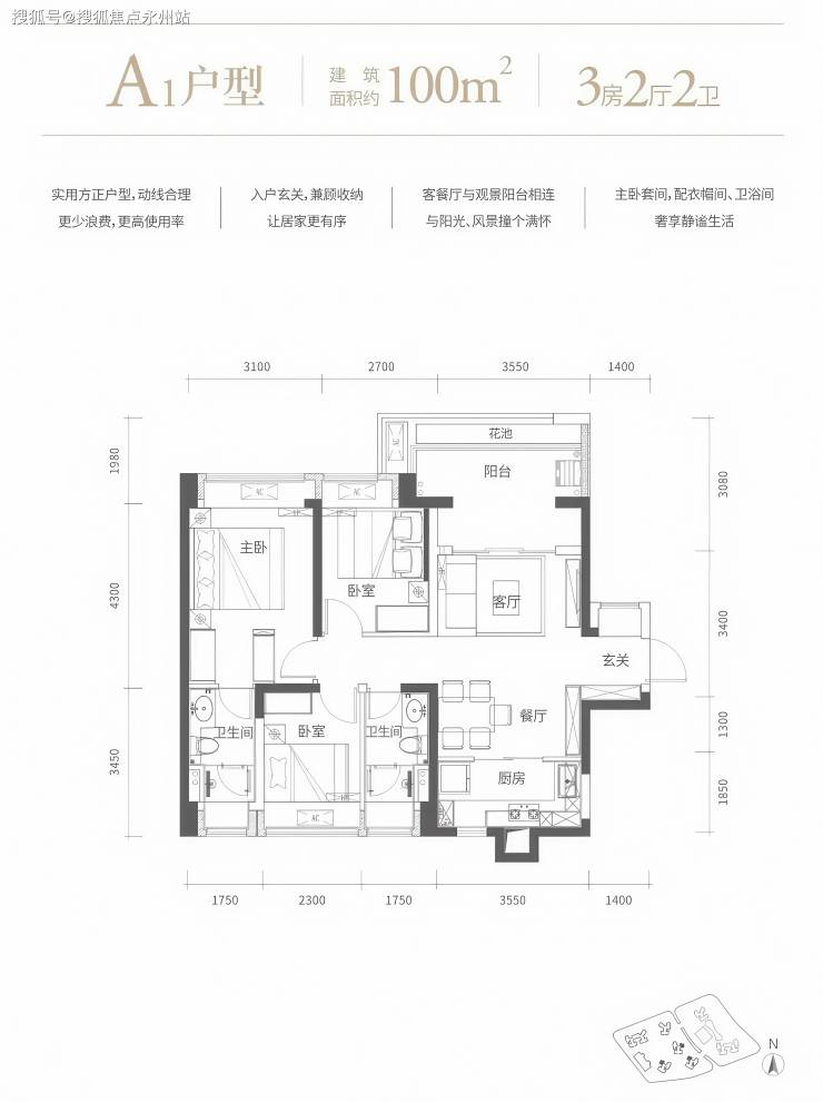 100㎡的3房2厅2卫,A1户型,设计的是竖厅格局,客厅3.55米开间,进门玄关,LDKB一体化设计,动静分区,3个卧室分别做到了主卧15.19㎡/次卧8.64㎡/次卧7.93㎡(包含墙体飘窗),L型厨房,卫生间干湿分离,得房率72.63%(不含赠送),阳台主朝西北向。