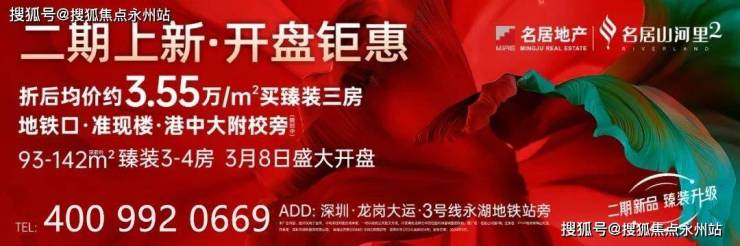 龙岗区【名居山河里2期】3月8日盛大开盘,均价3.55万带装修,四房总价440万左右的,三房总价310万起,南北通透的340万左右,在售面积95-141㎡3-4房,3号线地铁口200米。准现房,港中文学校旁。总建面约48万㎡山河大城崛起,匠筑城市封面级立面,毫米级精工雕琢空间。室内设计以人为本,s型冰箱位、LDK+G一体化设计更显奢阔,户型方正,户户朝南,大面积采光,带IMAX宽景阳台,俯瞰山河,诠释生活的至臻格调。