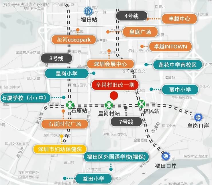 地理位置:位于福田福民路与皇岗二街交汇处西北角,地铁 7 号线皇岗村站 C 出口直达,步行 10 分钟可达皇岗口岸,2 站地铁至福田高铁站,形成 "双口岸 + 双枢纽" 的立体交通网络。