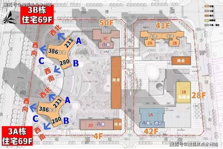 整体分两期开发建设,其中:项目一期东地块包含1栋酒店+商务公寓、1栋保障房、2栋包含一、二单元的住宅;西地块包含2栋高约250米的超高层住宅,另有1栋约50层高的商务公寓。项目二期2栋住宅建筑,地上69层地下3层,建筑高度超过247米。