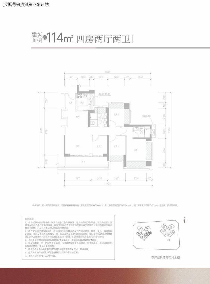 114㎡的4房2厅2卫:设计的是经典竖厅格局,客厅3.8米开间,进门独立玄关,LDKB一体化设计,S墙设计预留冰箱卡槽位,4个卧室分别做到了3.8米/3.2米/2.55米/2.44米的宽度,U型厨房,公卫三段式分离设计,得房率约:95%(包含赠送),客厅连接次卧出6.2米的大阳台,朝东南向。