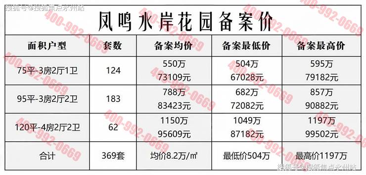 凤鸣水岸花园于2022年9月19日取证入市,推出1/2栋,共369套住宅房源,面积75㎡的3房1卫,95㎡的3房2卫,120㎡的4房2卫户型,备案均价8.2万/㎡,备案单价6.7-9.95万/㎡,备案总价504-1197万/套,精装现房。