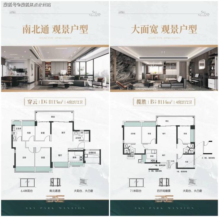 而约113-114㎡四房有两种户型,均采用了大面宽、大阳台设计。其中一种户型客厅和卧室全部看公园景观;另一种户型采用南北通透的经典格局。在阳台、飘窗、户型空间尺度、流线等方面,都做得相当出色。