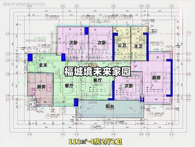 113㎡的4房2厅2卫,设计的是横厅南北通透格局,独门独户,进门入户玄关,客餐厅6.2米开间,LDKB一体化,全屋10面飘窗,主卧南北通,4个房间分别做到了主卧15.41㎡/次卧9.91㎡/次卧9.9㎡/次卧8.33㎡(去掉墙体,包含飘窗),客厅连接次卧出6.8米长的大阳台,U型厨房,卫生间干湿分离,得房率约95.73%(包含赠送),阳台主朝东南向。