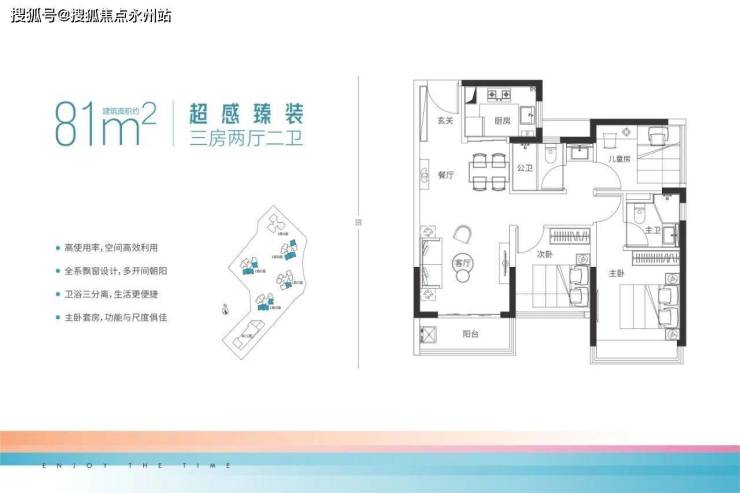 约81㎡三房两卫(1栋B座01/02/05户型、1栋C座01户型、1栋D/E座01/02/06户型)竖厅格局,餐客一体,动静分区结构,客厅开间约3.2米,主卧开间约3米,两个次卧开间约2.7米,约2.3米,阳台有东南、东北和南朝向。