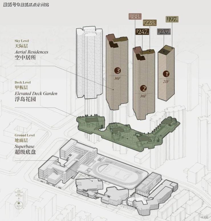 建筑形态:4栋住宅(3栋48层超高层+1栋25层高层)+1栋幼儿园,采用“浮岛甲板”设计,打造垂直共生社区。