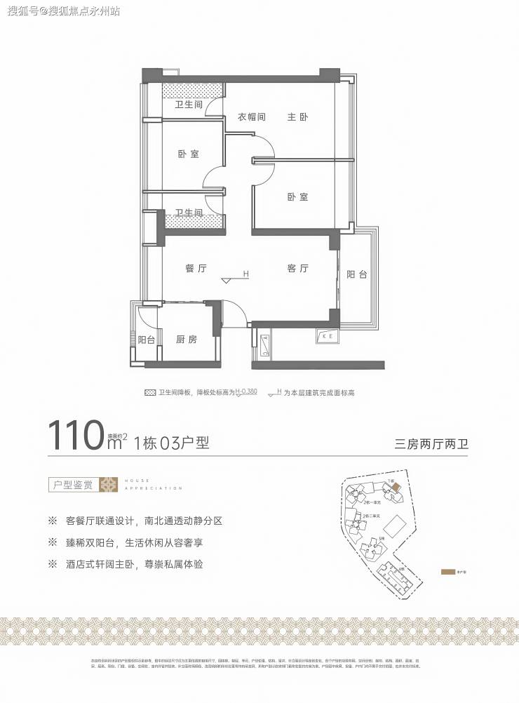 110㎡户型:三开间朝南,主卧宽3.4米,客厅连通景观阳台(南向),北向阳台可眺望梅林山景,得房率约74.81%