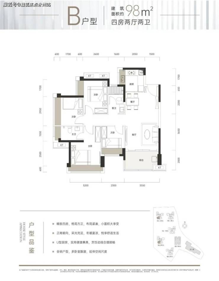 98㎡的4房2卫,设计的正南向竖厅格局,客厅3.55米开间