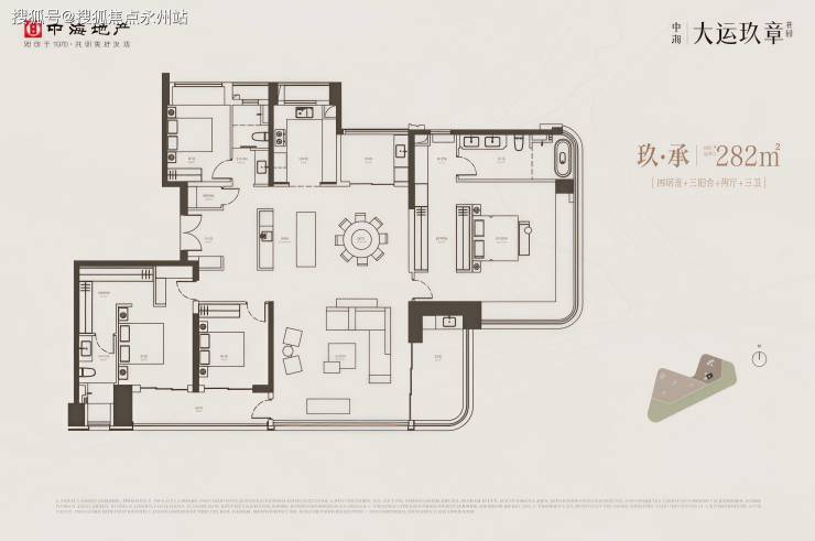 282㎡四房三卫(2梯2户,全小区仅43席)东南向无遮挡户型,占据楼栋端头位置,270°环幕视野覆盖大运湖、大运体育中心及城市天际线。