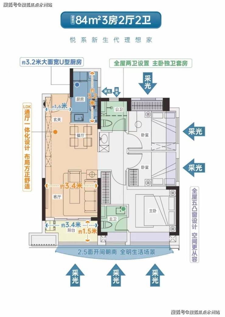 约84㎡3房1.5卫(1/2/3/4栋02/05户型)传统竖厅格局,动静分区,客厅开间约3.4米,主卧开间约4.8米(含0.5个卫生间),主卧卫生间空间小,不能淋浴,两个次卧开间约2.3米、约2.5米;02户型西南朝向,05户型东南朝向。