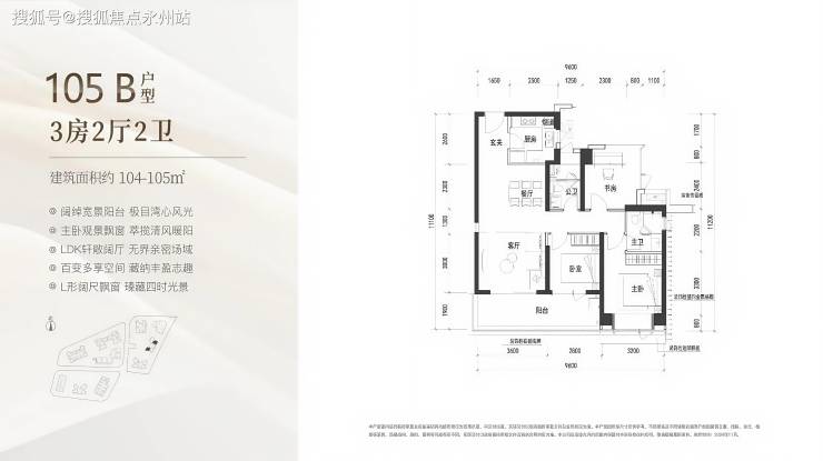 105㎡的3房2厅2卫,B户型(2栋3单元02/06户型),设计的是经典竖厅格局,客厅3.6米开间,LDKB一体化设计,三开间朝南,动静分区,3个卧室分别做到了主卧13.12㎡/次卧9.9㎡/次卧8.4㎡(包含墙体飘窗),客厅连接次卧出6.4米长的宽景大阳台,U型厨房,卫生间干湿分离,得房率约90%(包含赠送),正南或东南朝向。(深圳南山翰熙典居售楼处电话:400-992-0669)