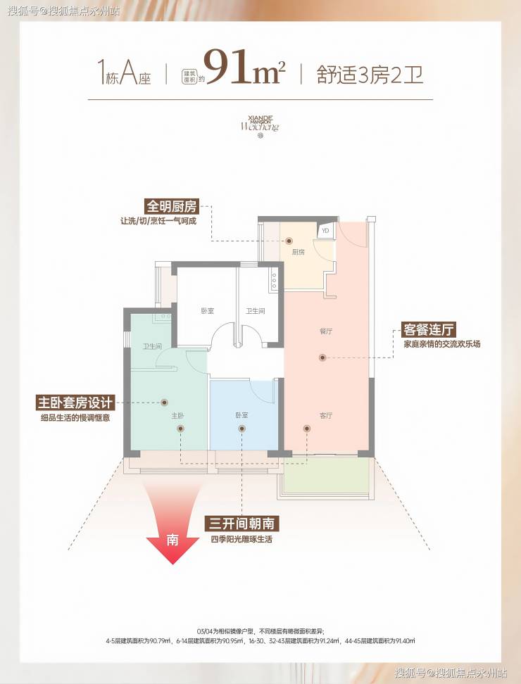 91㎡三房:总价259-280万,单价2.84-3.07万/㎡。
