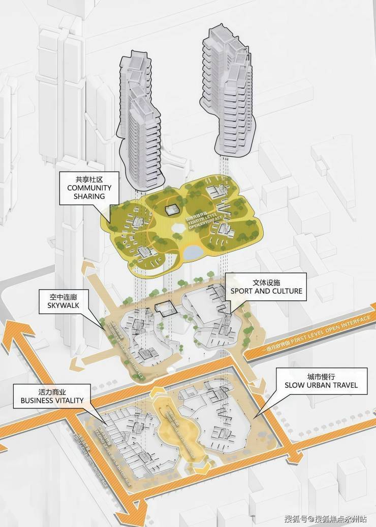 18米抬升底盘:打造“浮岛双境”设计,底盘一层规划落客区、社区商业,二层接入深超总连廊系统,上层为住宅与园林,实现“人车分流”“动静分离”,提升居住静谧性。