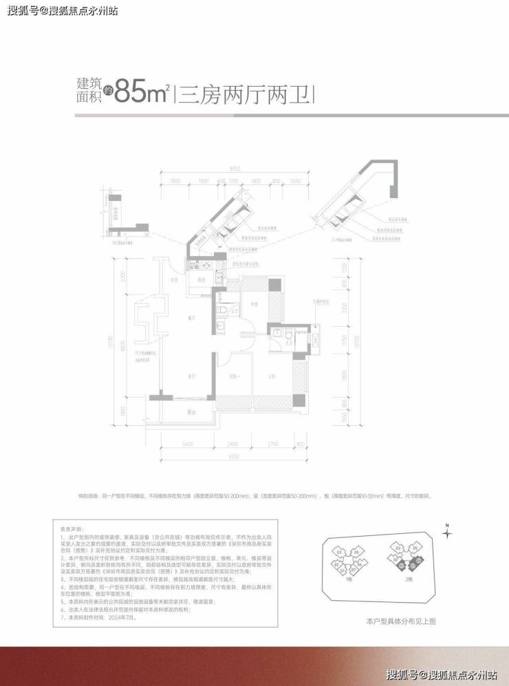 85㎡的3房2厅2卫:设计的经典竖厅格局,客厅3.4米开间,LDKB一体化设计,S墙设计预留冰箱卡槽位,3个卧室分别做到了3.55米/2.6米/2.4米的宽度,U型厨房,公卫三段式分离设计,得房率约:95%(包含赠送),阳台进深1.8米,有西南或东南朝向。
