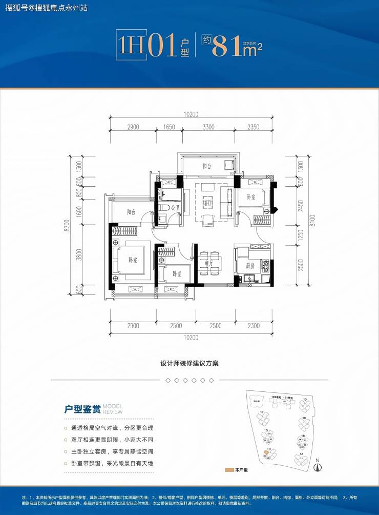 81㎡三房两厅两卫:折后总价284-312万,单价3.46-3.80万/㎡。
