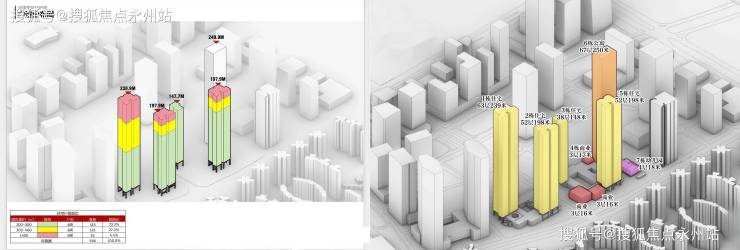 北区:1栋住宅63层约239米,2栋住宅52层约198米;南区:3栋住宅38层约148米,4栋商业3层约17米,5栋住宅52层约198米,6栋商务公寓67层约250米,7栋幼儿园4层约18米,另有两座3层约16米的商业盒子。