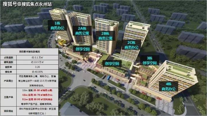 项目共由9栋建筑组成,1栋、2栋C、4栋为 5.1m层高的办公产品,2栋A和2栋B为 3.6m层高的商务公寓;2栋D、E、F和 3栋的 3-4层是 5.1米层高的创享空间,1-2层则为商业。