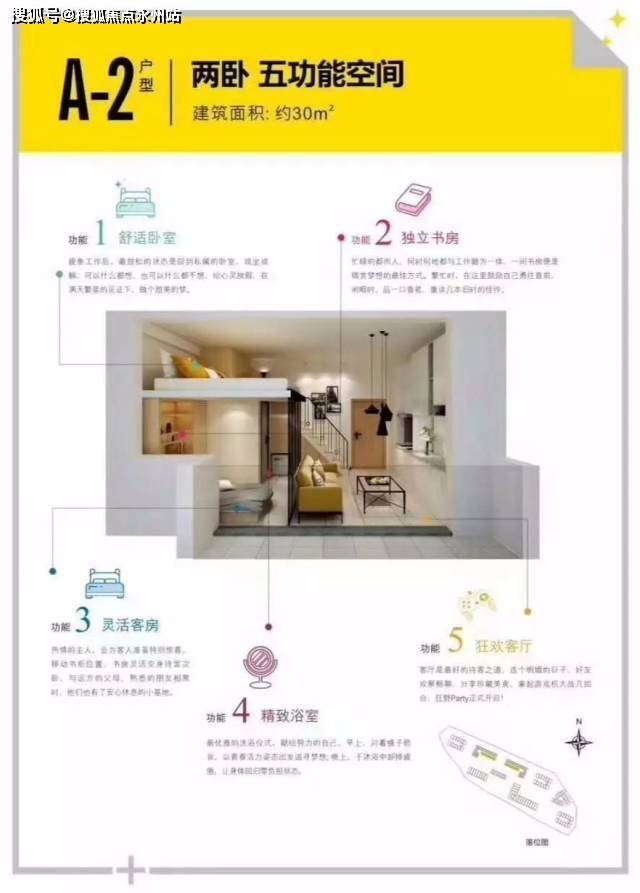 A-1户型品鉴:3.6米层高,单面采光,上下分层布局合理,收纳、起居、空间相对独立。较高的采光高度,足以满足室内自然光线的明亮,小阳台也可完全满足日常外界接触空间和晾晒的需求。