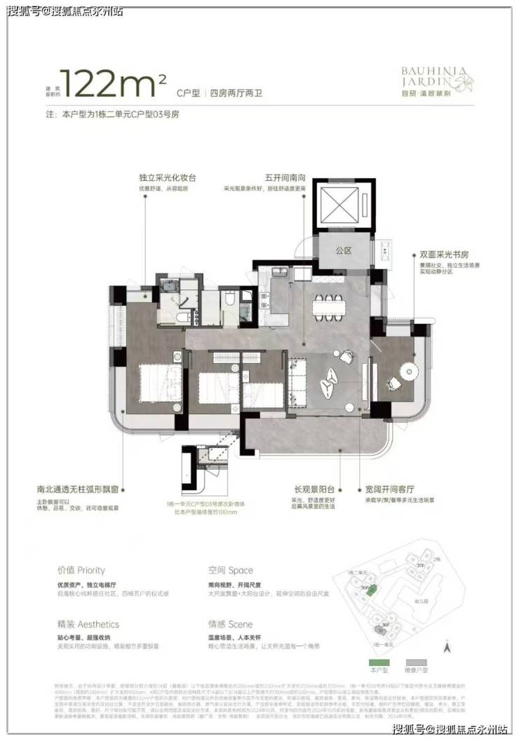 122m²四房两厅两卫的C户型:双龙抱珠户型,书房分布于客厅另一侧,且难得是双面采光+270°景观视野。主卧南北通透,且拥有十分开阔的景观面。贯通式阳台联通客厅以及靠近动区的次卧,实现长观景阳台。