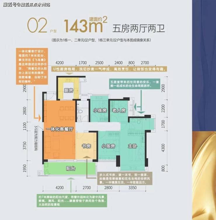 02户型-143㎡五房两厅两卫:为市面少见的5房设计,户型方正、全明通透、4开间朝南,入户带宽阔玄关、客厅开间高达约4.2米、阳台面宽高达约6.9米,书房可与客餐厅打通、变成媲美大平层豪宅尺度的超大公区,是一步到位、终极改善的优选。