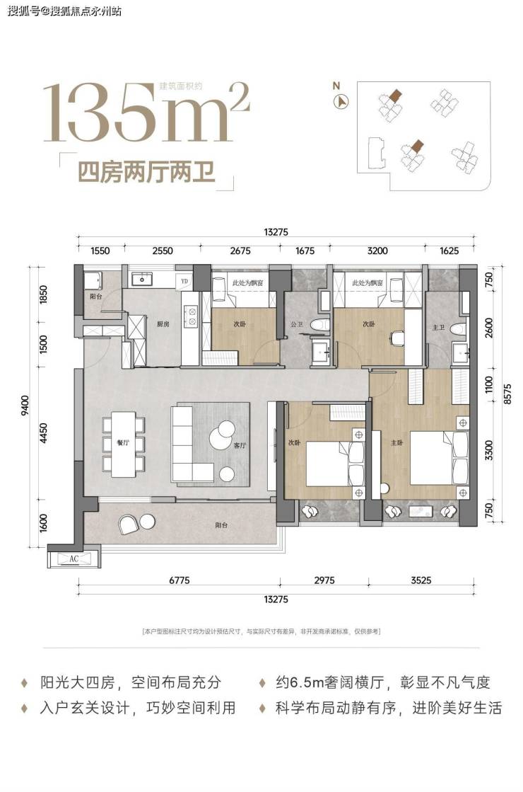 约135㎡四房两卫(1栋1/2/3单元01户型)横厅格局,约30㎡方正大客厅,约6.77米超长阳台,南北通透。