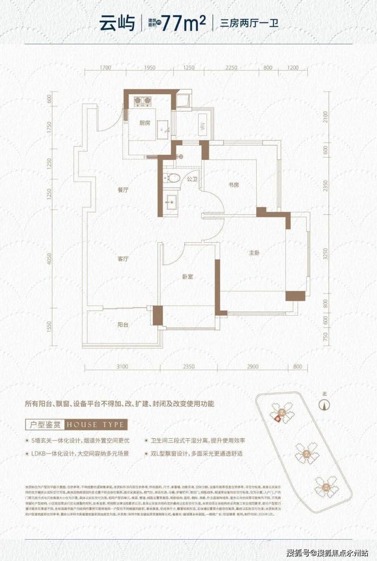 约77㎡三房一卫:经典竖厅设计,三开间朝南,客厅开间3.3米,得房率约88%,低门槛上车龙华三房,适配刚需首置家庭。
