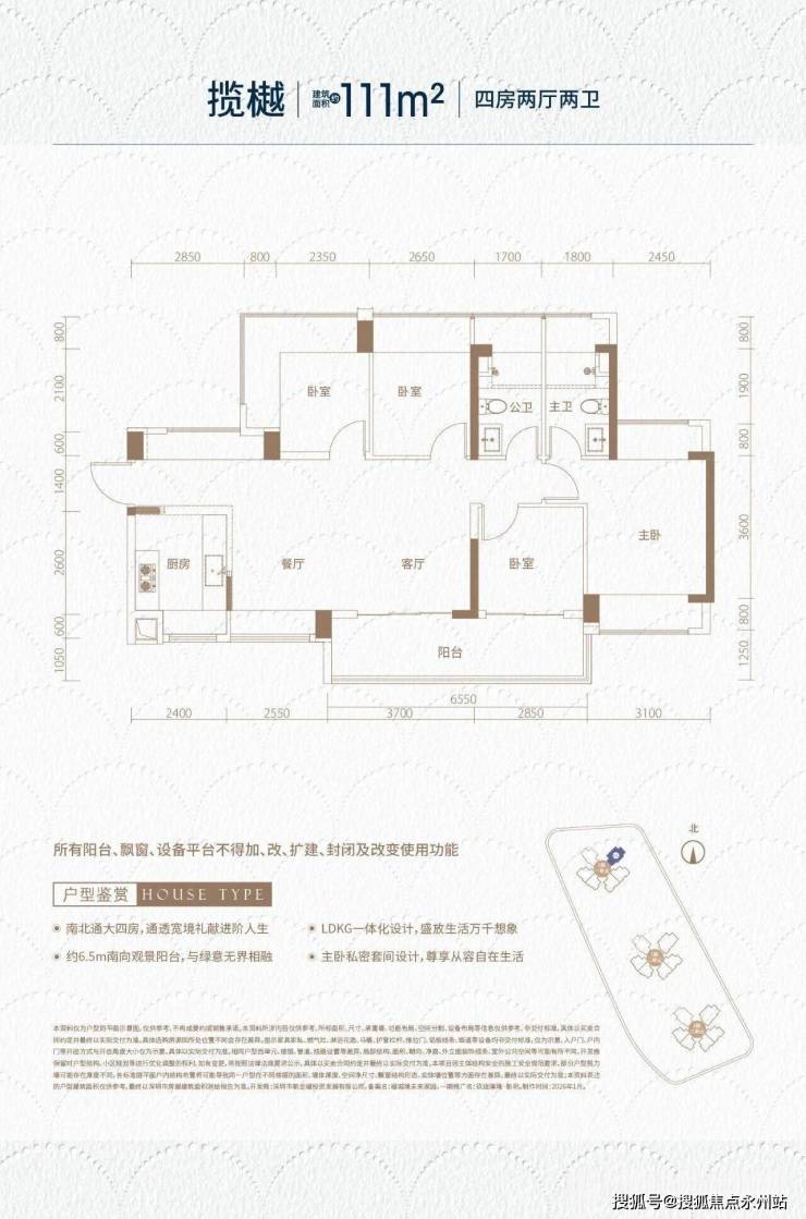 约111㎡四房两卫:核心改善户型,横厅设计,客餐厅开间达6.2米,连接6.8米大阳台(贯通次卧),得房率约95.73%,适配多人口家庭。