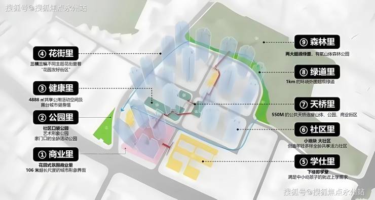规划了约500米的立体城市连廊系统,串联全龄教育、精致商业、品质人居、活力运动、公园休闲等功能板块。