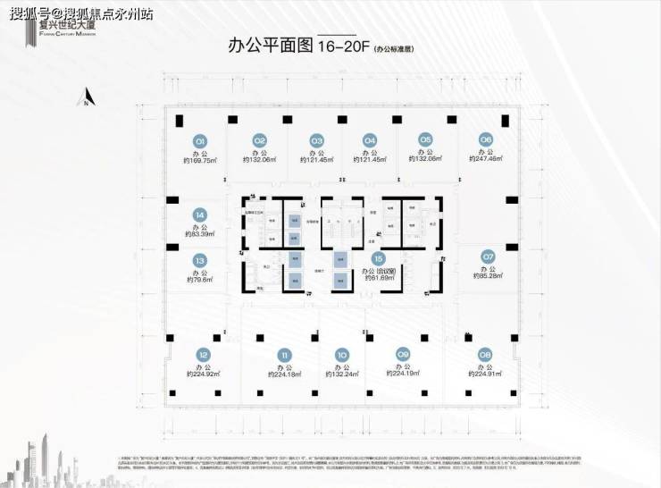 办公产品:建面61㎡-2300㎡,可自由组合,楼层15-20层,层高4米,办公环境宽敞明亮,6梯15户,高效便捷