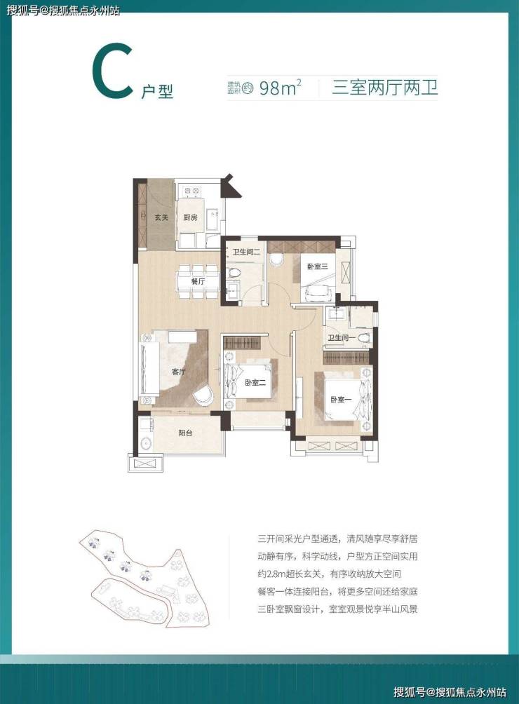 98㎡的3房2厅2卫:设计的是经典竖厅格局,餐客厅一体化设计,三开间朝南,U型厨房,得房率:79.25%(不含赠送),阳台朝西南或东南向。