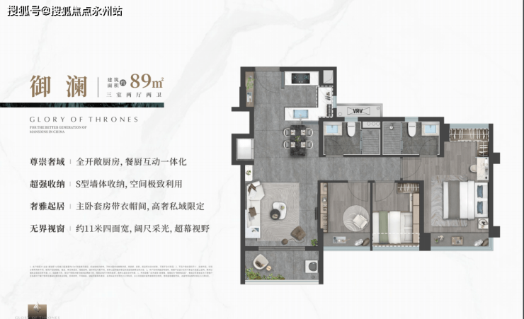 89㎡的3房2厅2卫,设计的新版竖厅户型,全开敞厨房,S型墙体收纳,主卧套房带衣帽间,约11米四面宽超幕视野,有西北、西南、东北、东南4个朝向。