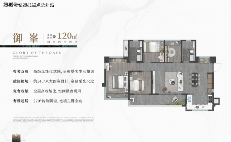120㎡的4房2厅2卫,设计的横厅南北通透格局,约14.7米超幕视野,超长阳台,主卧转角270°大飘窗。