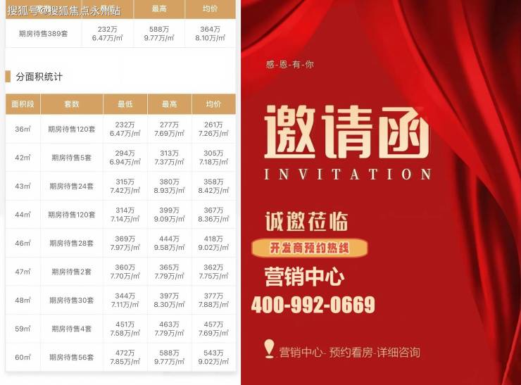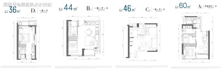 公寓:36-60㎡一至两房(总价200万起),精装交付,通燃气,单价为住宅的6-7折(6-8万/㎡)。