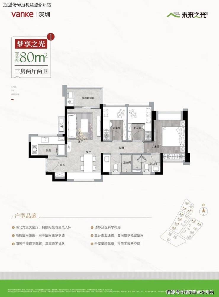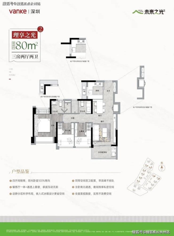 80㎡的3房2厅1卫,01.02/05/06户型,设计的是竖厅格局,进门入户玄关,LDKB一体化,S墙设计预留卡槽冰箱位,四开间朝南,U型厨房,卫生间干湿分离,得房率80.69%(不含赠送),西南或东南朝向。