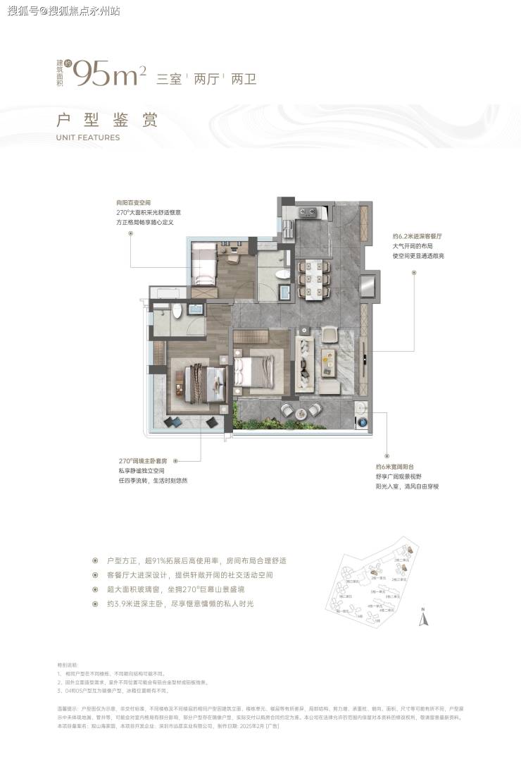 95㎡三房两卫:东北向看山景或西南向看海,竖厅格局,LDKB 一体化设计,阳台连通次卧,主卧270° 观景飘窗,得房率约91.6%(含赠送),折后总价687-758万/套。