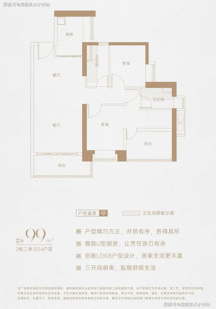 99㎡3房2厅2卫:动静分区,三开间朝南,L型厨房,西南朝向阳台,得房率约73%(不含赠送)